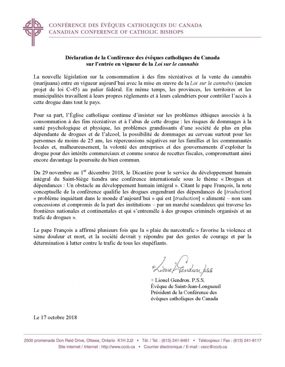 17 octobre: entrée en vigueur de la Loi sur le cannibis; déclaration de la Conférence des évêques catholiques du Canada 18-10-2018